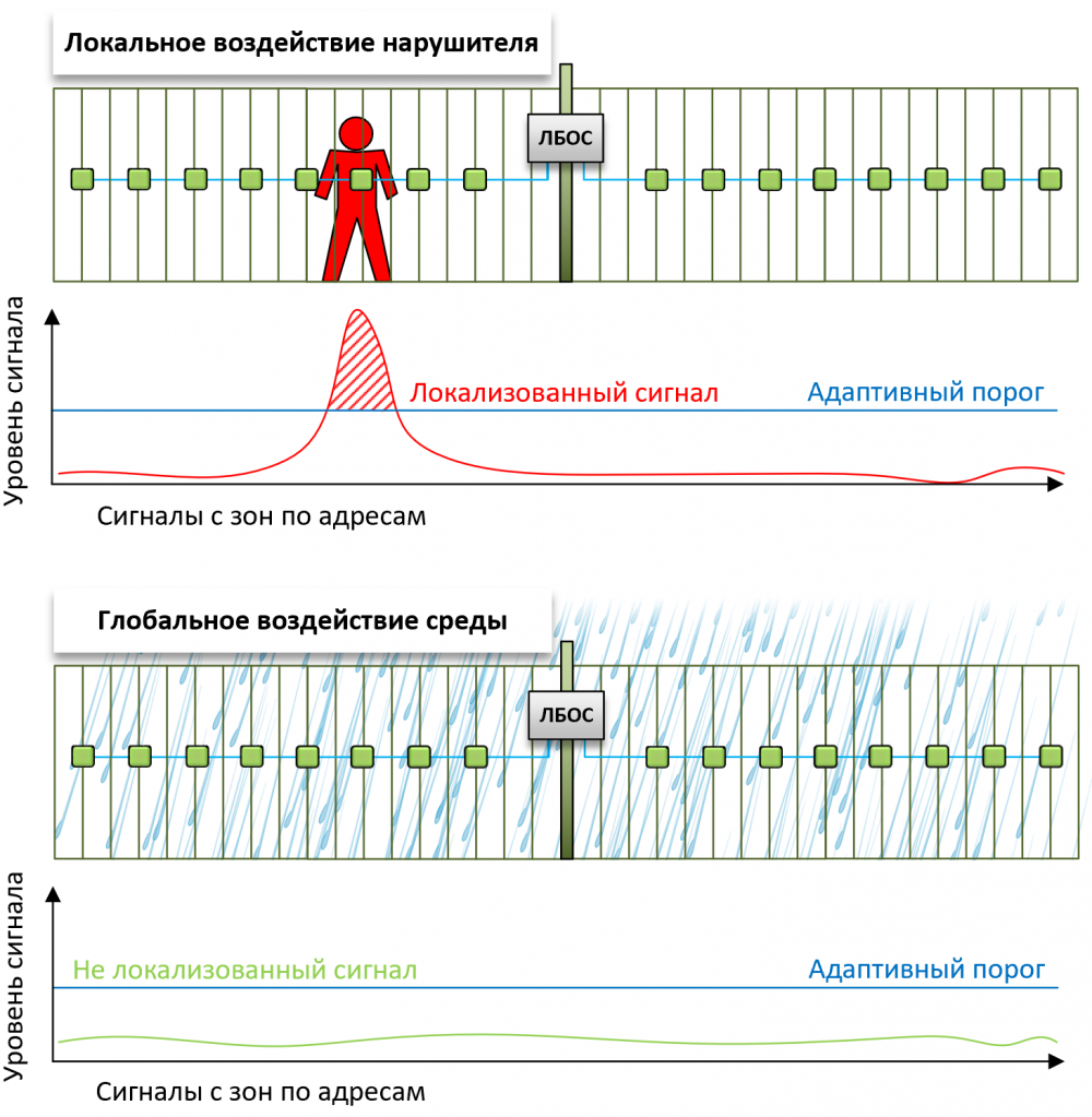 spatio-temporal analysis of signals from zones to determine the localization of the effects of a real intruder, affecting only 1-2 zones at a time, against the background of global weather effects, such as heavy hail, heavy rain, hurricane, affecting several zones at the same time.