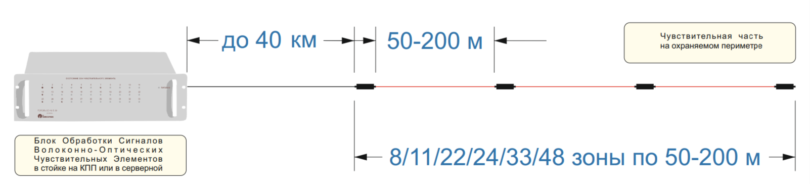 The sensitive part of the cable can be located at a distance of up to 15 km from the data processing unit, which allows it to be placed in a guarded checkpoint and collect extended perimeters without the need to organize the protection of object cabinets and equipment.
