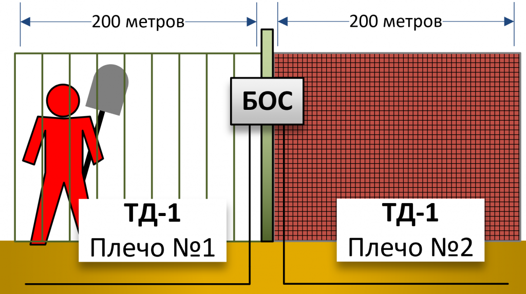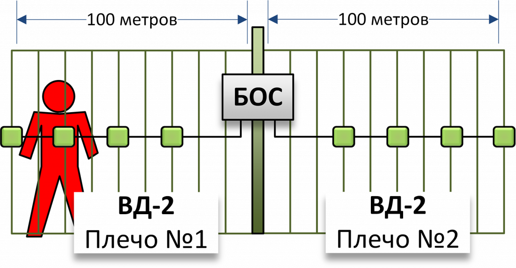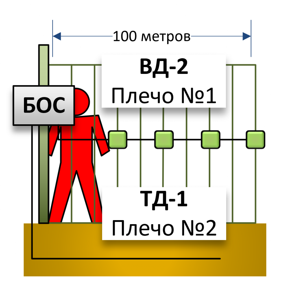 Also, one detector allows you to build two security lines in one protected area, for example, use VD-2 point vibration sensors to protect the fence from destruction (overbite, bending, etc.), and the TD triboelectric cable -1 from climbing the fence by a trained intruder using a ladder: