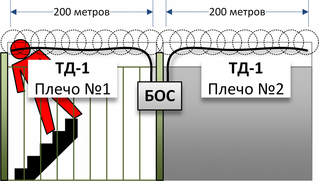 TD-1 can be used in three options for building a guard line: 1) The cable can be mounted directly to a mesh or wire fence, a fence made of thin boards, a picket fence, thin metal (corrugated board) or polycarbonate. Thus, it is possible to protect the perimeter both from climbing the fence, and from its destruction (overshot, bending, etc.).
