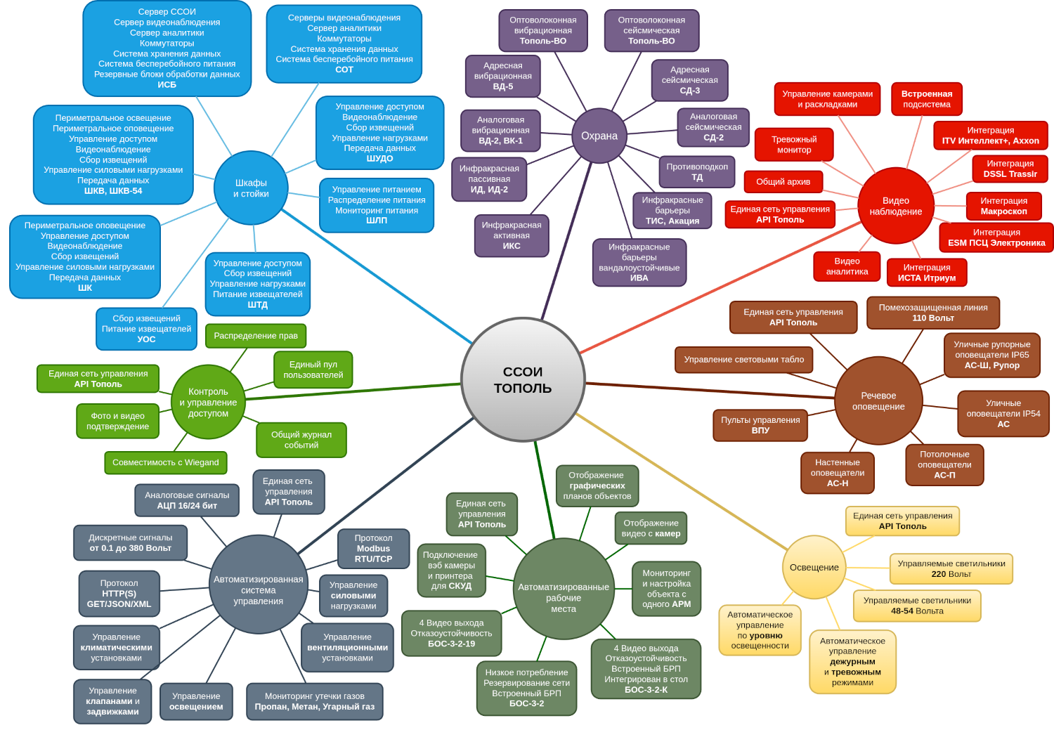 Охрана, видеонаблюдение, контроль и учет доступа, оповещение, освещение, сбор, обработка и хранение данных, автоматизированные рабочие места, обьектовые шкафы и стойки управления в одной экосистеме.
