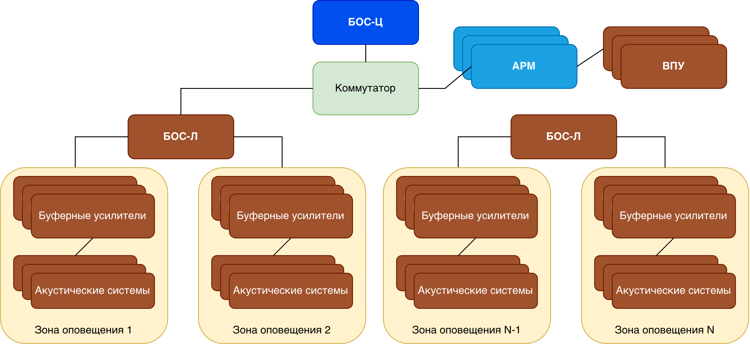 Общее количество зон оповещения и их мощность в системе не ограничены.