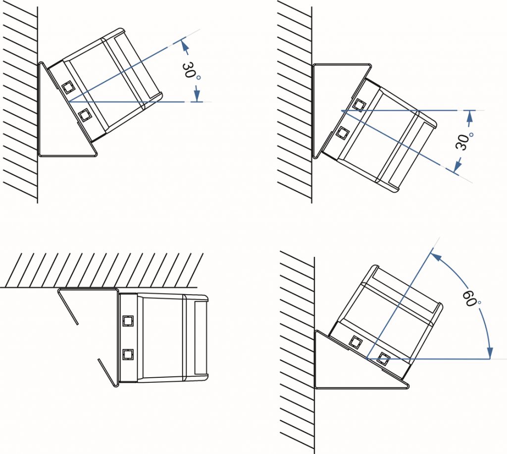 В зависимости от способа установки кронштейн может иметь угол 30°, 60° или 90°.