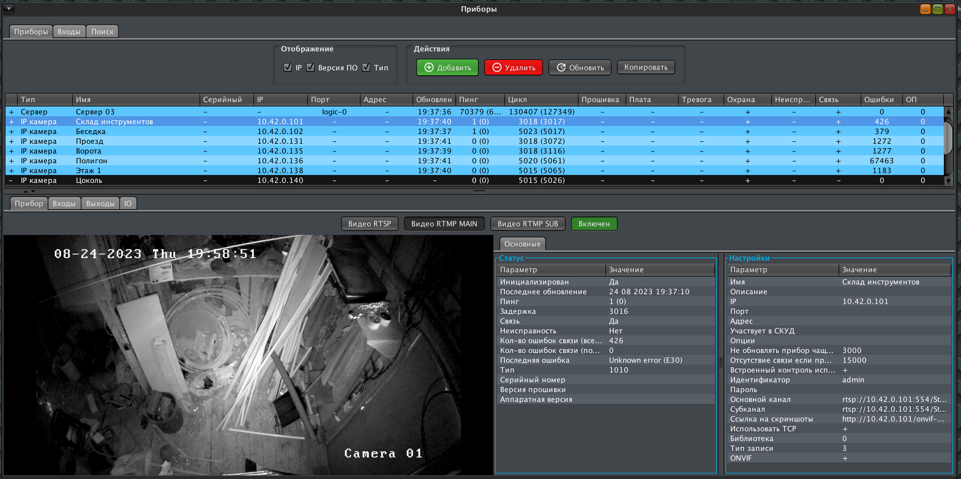 Программное обеспечение позволяет осуществлять: - Параллельный не блокирующий сбор данных с различных интерфейсов - Обработку данных - Принятие решений и контроль исполнения - Отображение состояния системы на графическом интерфейсе с подробными графическими планами - Конфигурирование системы в режиме реального времени с помощью графического интерфейса - Хранение событий локально в формате JSON - Хранение слепков сигналов в собственном открытом формате DLOG - Выгрузку событий и слепков сигналов на SQL сервера - Обмен данным со сторонним программным обеспечением, в том числе системами видеонаблюдения