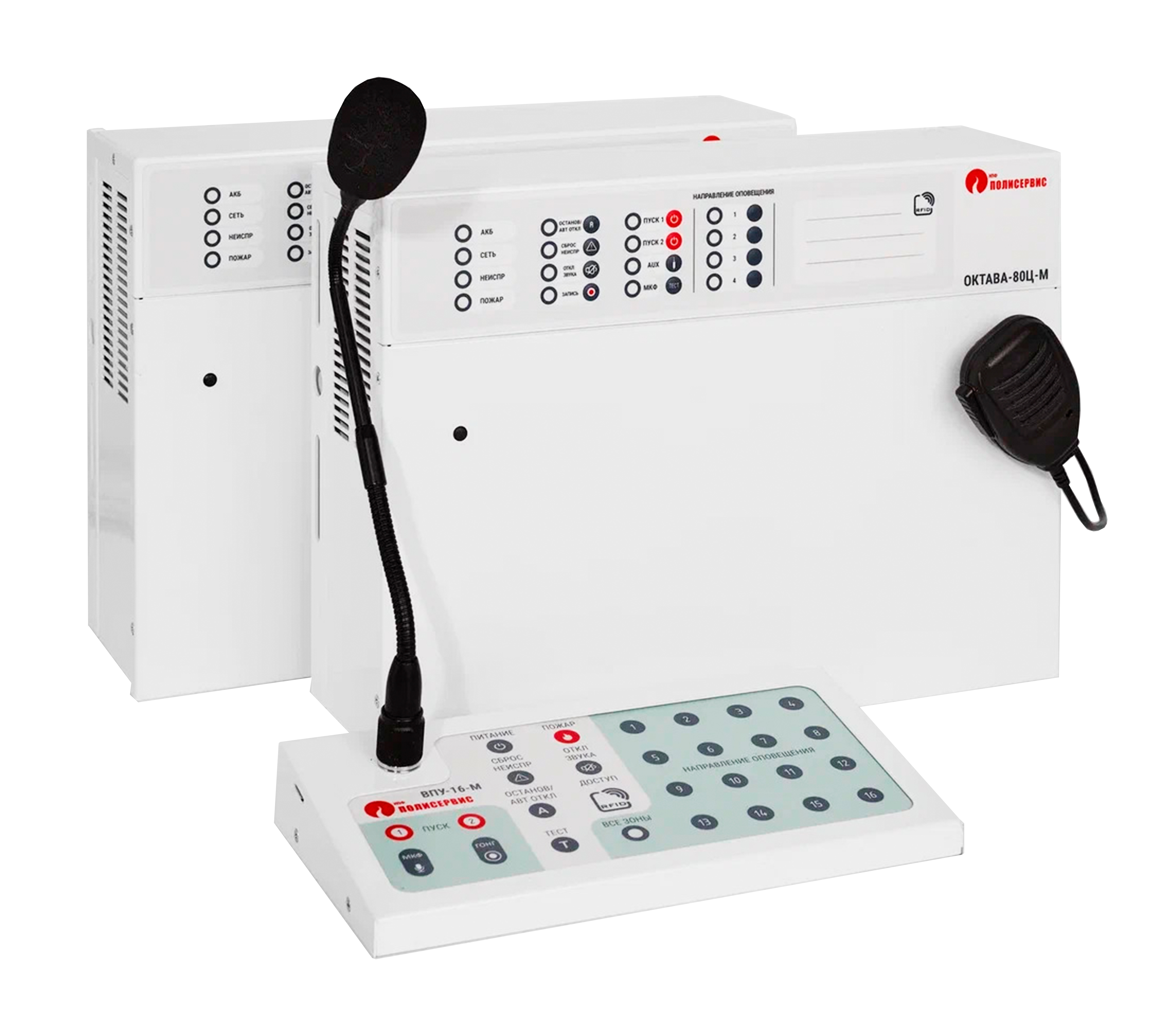 | Октава-80Ц | Центральный блок системы «Октава-80», предназначен для оповещения людей о пожаре в автоматическом и полуавтоматическом режиме, имеет выходы речевого оповещения. Прибор управления оповещением «Октава-80Ц» соответствует требованиям