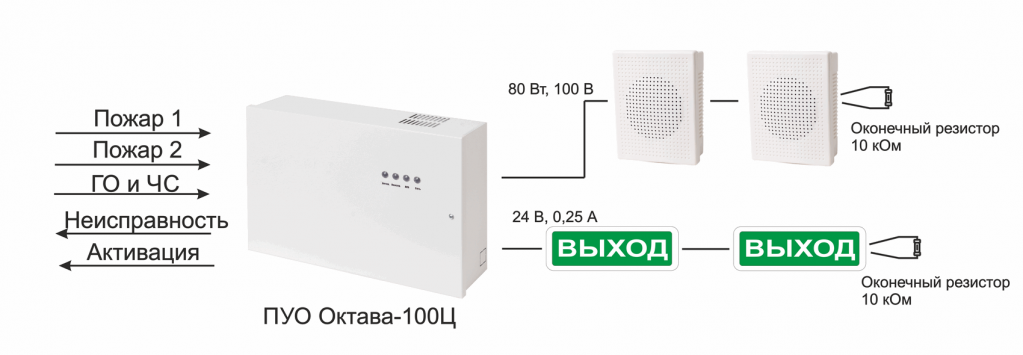 Система Октава-100 позволяет строить системы пожарного оповещения начиная с простого однозонного проекта, где используется один центральный прибор Октава-100Ц и оповещатели: