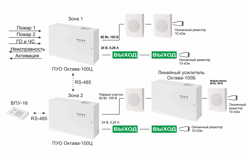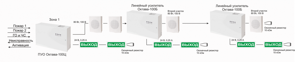 Система речевого оповещения «Октава-100» предназначена для обеспечения своевременного оповещения людей о пожаре и управления эвакуацией. Система состоит из приборов управления оповещением «Октава-100Ц», усилителей линейных, пультов управления ВПУ-16 и речевых оповещателей АС. Связь между составными частями системы осуществляется по RS-485, что позволяет строить сложные структуры оповещения с линиями связи большой протяженности. В зависимости от состава, система обеспечивает от 1 до 16 зон речевого и светового оповещения, при этом мощность каждой зоны можно увеличивать с помощью линейных усилителей. Простое увеличение от 1 до 16 зон оповещения; Экономия проводов за счет размещения блоков системы непосредственно в зоне оповещения; Управление световым оповещением; Внешний пульт управления с обратной связью;