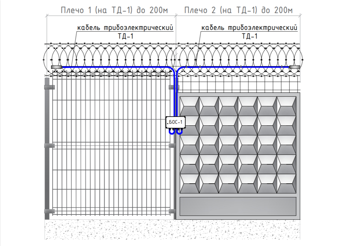 Трибоэлектрический кабель ТД-1 - преобразует колебания ограждения, вызванные нарушителем в момент проникновения на охраняемый периметр, в электрический сигнал за счёт трибоэлектрического эффекта. Кабель является самым дешевым и простым чувствительным элементом - монтаж заключается в креплении кабеля с помощью стяжек к охраняемой поверхности. В случае разрыва или повреждения кабеля в процессе эксплуатации, его можно починить без использования специальных инструментов.