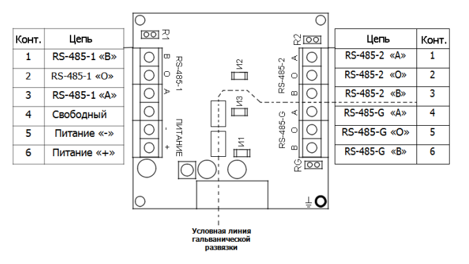 Гальванически развязанный вход RS-485-G имеет точку подключения заземления, выведенную под ближнее к разъёму крепёжное отверстие.