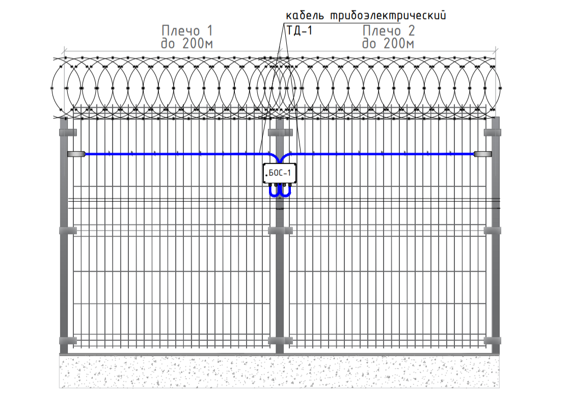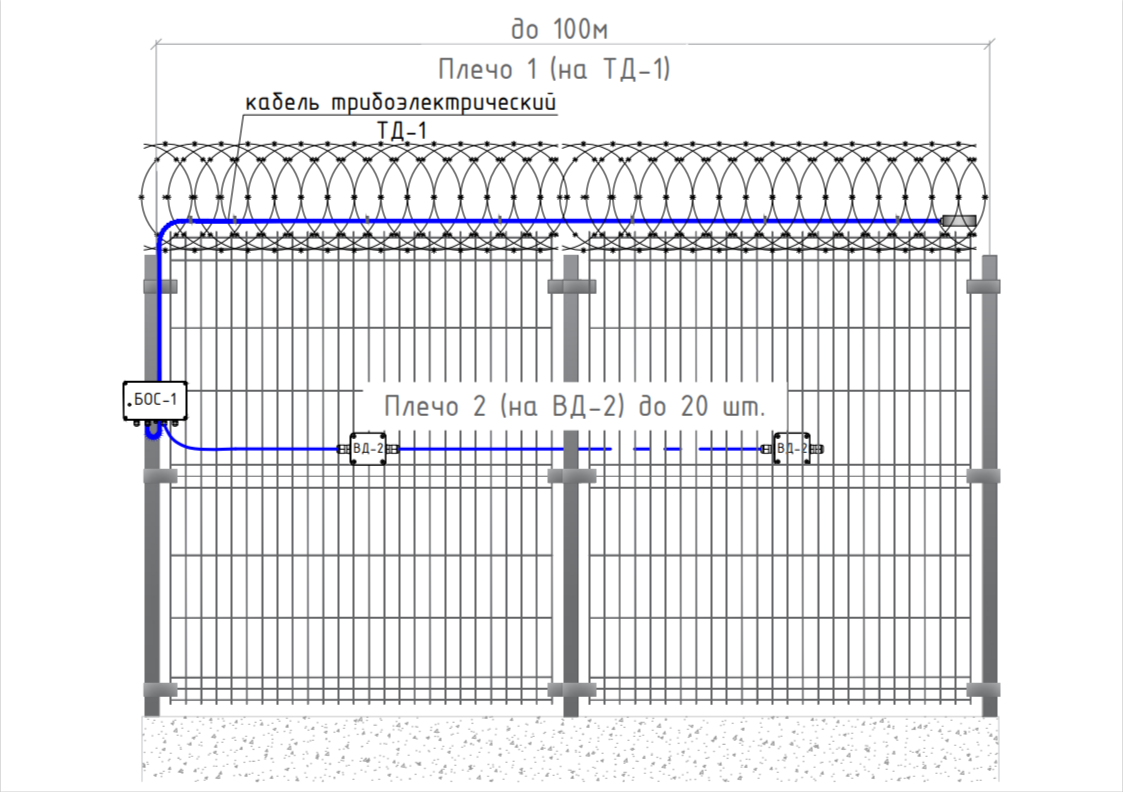 Также один извещатель позволяет построить два рубежа охраны в одной охраняемой зоне, например, использовать точечные вибродатчики ВД-2 для охраны ограждения от разрушения (перекуса, отгибания и т.п.), а трибоэлектрический кабель ТД-1 от перелаза ограждения подготовленным нарушителем с помощью лестницы: