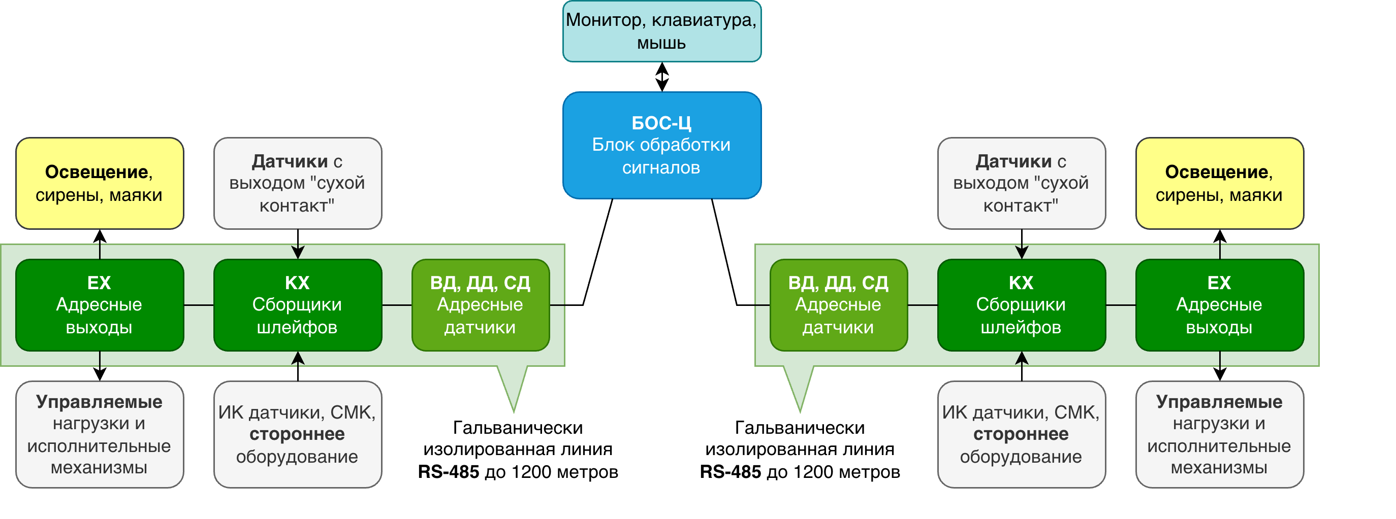 В минимальном варианте для построения системы достаточно центрального БОСа, к которому можно подключать гальванически изолированные линии RS-485 протяженностью до 1 километра каждая с цифровыми адресными датчиками, сборщиками сухих контактов КХ-6-3 и контроллерами управляемых выходов ЕХ-6-3.